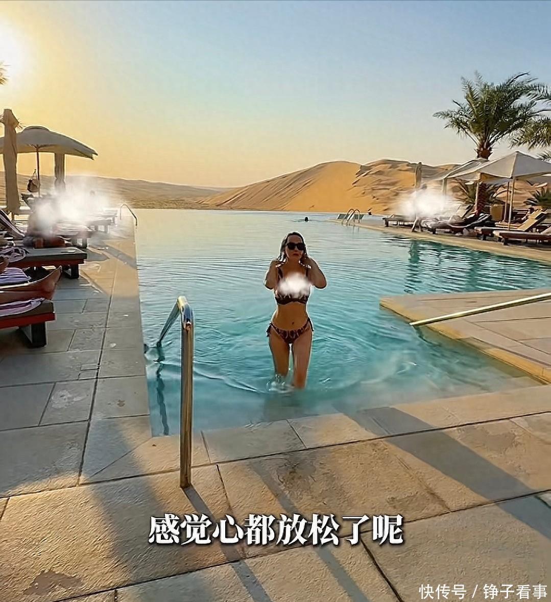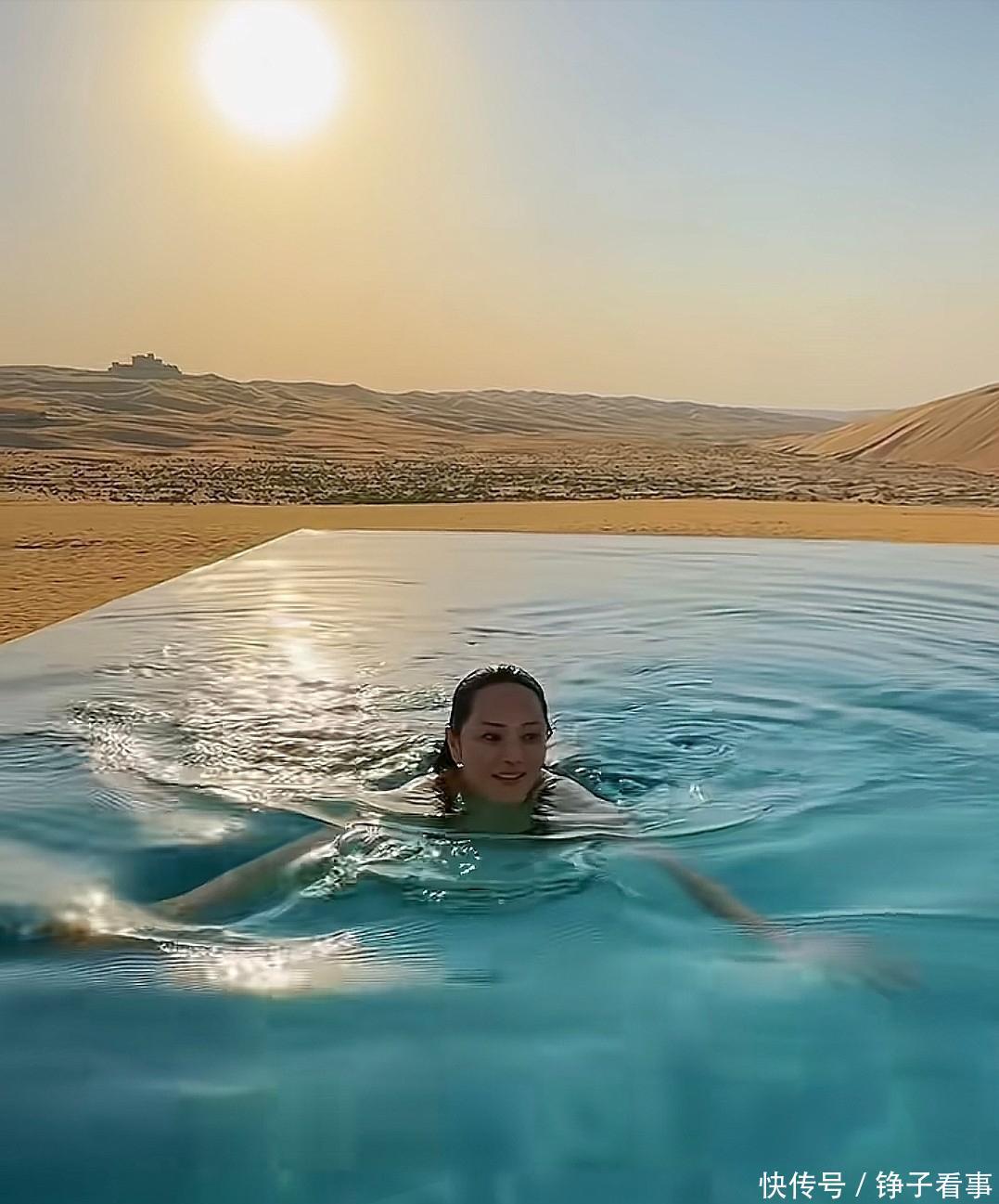 逛老街时,她挽着婆婆的手臂,一边帮挑丝巾,一边夸“这金灿灿的街道,只有您这样的气质才压得住”。嘴甜归嘴甜,手上也没闲着——两个购物袋全自己拎,还拦着秦昊:“你顾好米粒就行。”路过咖啡摊,不忘给公婆点无因阿拉伯咖啡,顺手加两勺蜂蜜,“妈怕苦嘛”。 最让人惊艳的还是她在沙漠泳池里的那一幕。换上豹纹高腰泳裤,马甲线若隐若现,皮肤在阳光下泛着光。下水前还不忘调皮比个耶:“年纪大了,也想试试在沙漠游泳的感觉!”秦昊就在池边守着,相机没停过;米粒扑过来撒娇,一家人的互动自然又温馨。